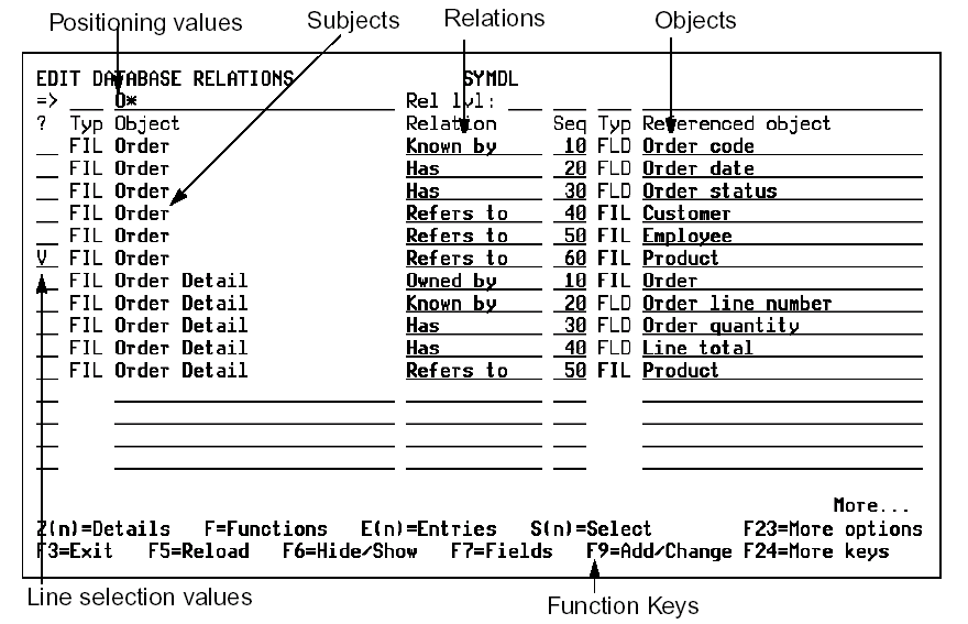 File entries are resolved from CA 2E relations that you use to describe file relationships in your model. An entry indicates the presence of a field on a file. A relation may imply that one or more fields are to be created for your file.