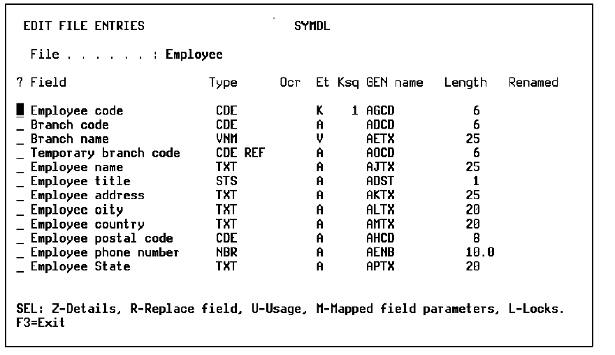 Note: CA 2E has created these entries for your Employee file as shown on the panel and indicated which entry is a key field (K), an attribute field (A), or a virtual field (V).
