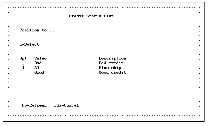 For example, to display a list of values for the Credit Status field, press F4 while positioning your cursor on the Credit Status field on the device file of a CA 2E generated program.