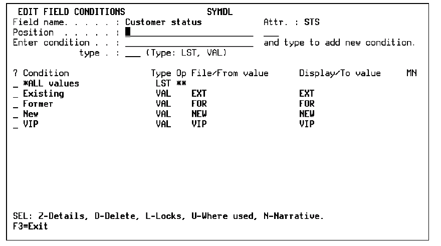 The Edit Field Conditions panel shows all the conditions that exist for a selected field. Use this panel to add or modify conditions.