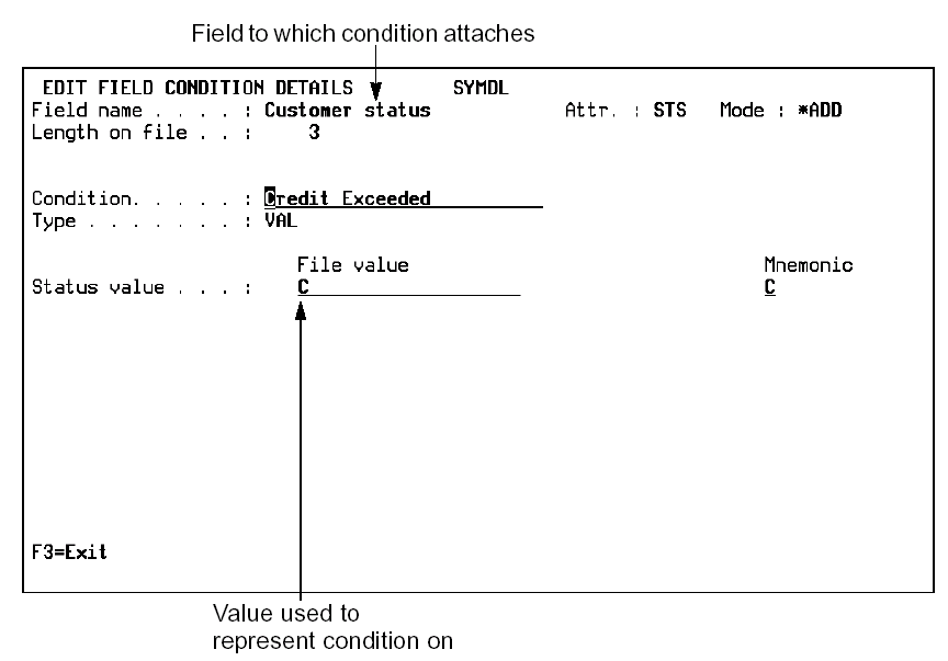 - If type is VAL, and Translate condition value is No, enter the file (storage) and mnemonic values for the condition.