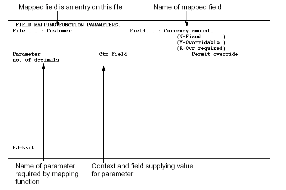 To access this panel from the Edit Database Relations panel, use an E to obtain the Edit File Entries panel to display the entries of the file that has a function containing the mapped user-defined field. Use an M against the entry to set up the additional parameter to the mapped user-defined field type function.