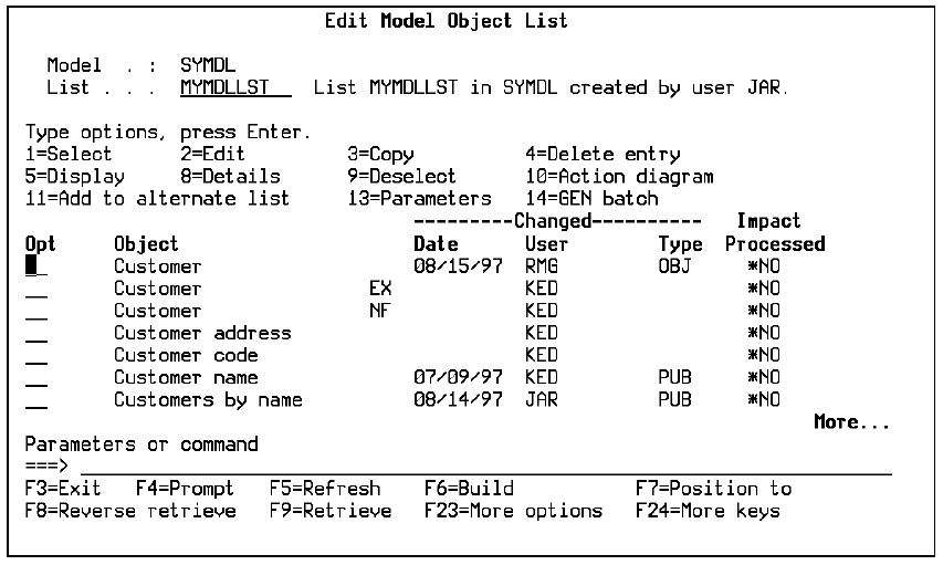 To view change information, press F11 on the Edit Model Object List panel until the change information as shown in the following panel displays: