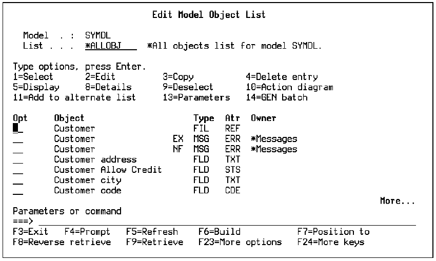 You can use the Edit Model Object List panel to operate on both named model object lists and the All Objects list (*ALLOBJ); however, some functions can be used only for named model object lists.
