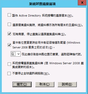 附註:如果叢集節點是 Active Directory 伺服器的話,您必須在還原系統狀態工作階段時,將主要節點重新啟動為目錄還原模式。