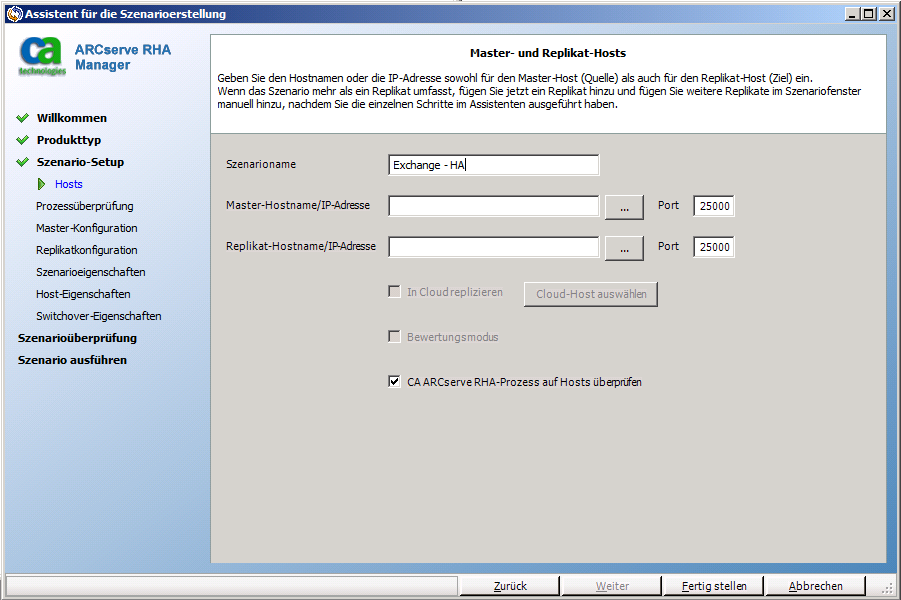 Wenn Sie den Assistenten zur Szenarioerstellung zum ersten Mal ausführen, geben Sie in die Felder "Master-Hostname/IP-Adresse" und "Replikat-Hostname/IP-Adresse" anstelle der Servernamen die CA-IP- und Replikat-IP-Adressen ein.