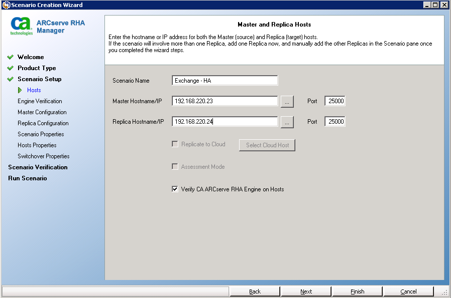 During the initial run of the Wizard, enter the RHA-IP and Replica IP addresses instead of the cluster virtual server names. The following screen shows the RHA-IP entered in the Master Hostname/IP field and the Replica Server IP address entered in the Replica Hostname/IP field.