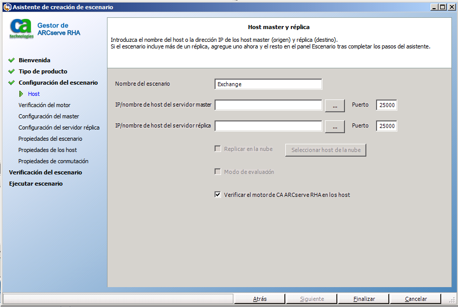 Durante la ejecución inicial del asistente, introduzca las direcciones RHA-IP e IP del réplica en lugar de los nombres de los servidores virtuales del clúster. La siguiente pantalla muestra la RHA-IP introducida en el campo IP/nombre de host del servidor master y la dirección IP del servidor réplica introducida en el campo IP/nombre de host del servidor réplica.