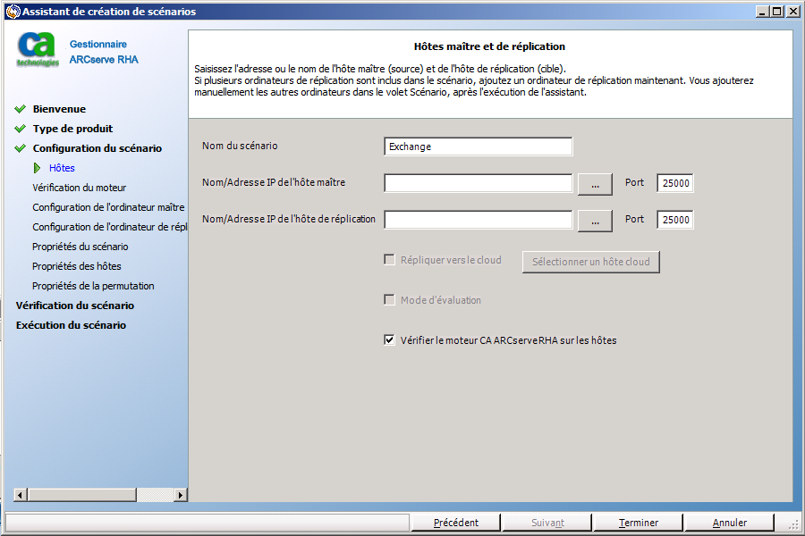 Lors de la première exécution de l'assistant de création de scénario, au lieu des noms des serveurs, entrez les adresses IP de CA-IP et du serveur de réplication dans les champs Nom/Adresse IP de l'hôte maître et Nom/Adresse IP de l'hôte de réplication.