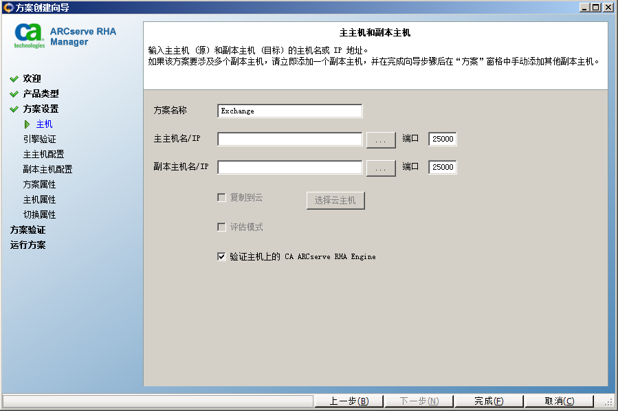 在“方案创建”向导的初步运行中,在“主服务器主机名/IP”和“副本主机名/IP”框中输入 Arcserve-IP 和副本 IP 地址,而不是服务器名称。