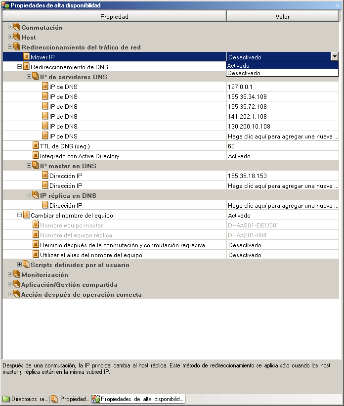 - En el panel Marco, seleccione la ficha Conmutación y después seleccione el servidor réplica como host de conmutación.