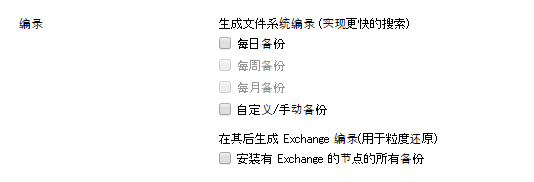 编录允许您生成 Exchange 粒度还原编录和文件系统编录。 还原 Exchange 邮箱、邮箱文件夹和单个邮件对象需要 Exchange 粒度还原编录。 执行更快、更简单的搜索需要文件系统编录。 如果您选中编录复选框,将根据您指定的备份类型启用编录。 清除复选框将禁用生成编录。