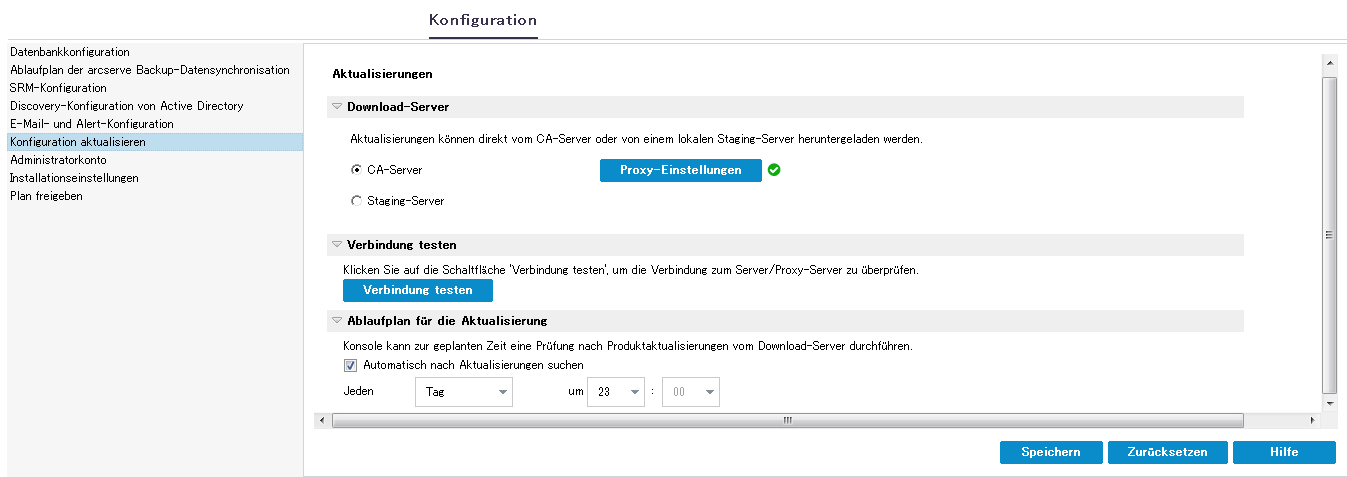 Auf der Seite "Konfiguration aktualisieren" können Sie Download-Server und Aktualisierungspläne für die Konfiguration von Aktualisierungen festlegen. Sie können Details über Arcserve Server-Proxy-Einstellungen oder Staging-Server für "Download-Server" angeben.
