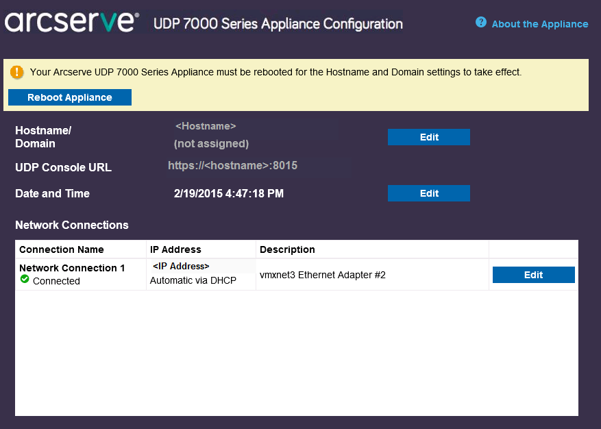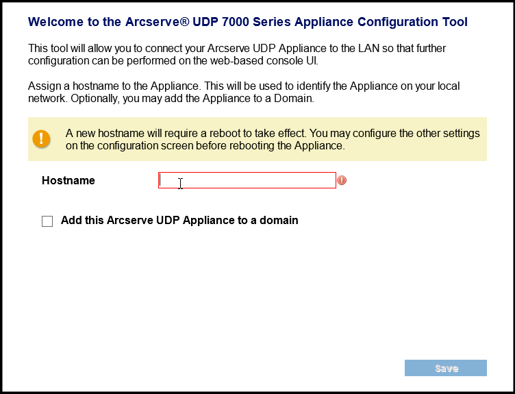 To manage the Arcserve UDP appliance, the first step is to have the appliance in your network. For that, you have to assign a hostname to the appliance and then configure network ports.