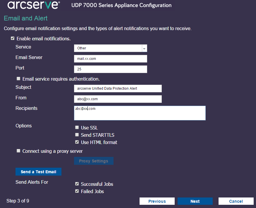 This dialog lets you define the email server that will be used to send alerts and the recipients who would get the alerts. You can select options specify to get alerts based upon successful jobs, failed jobs, or both.