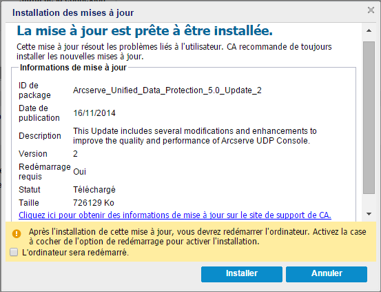 La boîte de dialogue Installation des mises à jour s'ouvre : elle contient les informations associées à la mise à jour disponible. Elle indique, notamment, une description, le statut de téléchargement, la taille, la configuration requise pour le redémarrage et un lien vers le serveur Arcserve pour des informations supplémentaires concernant les mises à jour.