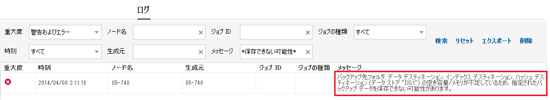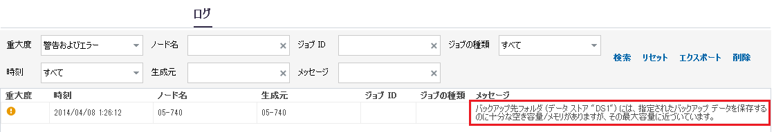 [ログ]タブには、データ ストアしきい値に関連するエラーまたは警告ステータスが頻繁に表示されます。 以下の図では、特定のフォルダに対するさまざまな種類のエラーまたは警告を示します。
