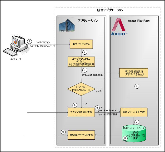 この段階で、アプリケーションは riskfortAPI の evaluateRisk() 関数を呼び出す必要があります。 この呼び出しでは、前の手順で収集したユーザおよびデバイス情報をすべて RiskMinder に渡す必要があります。