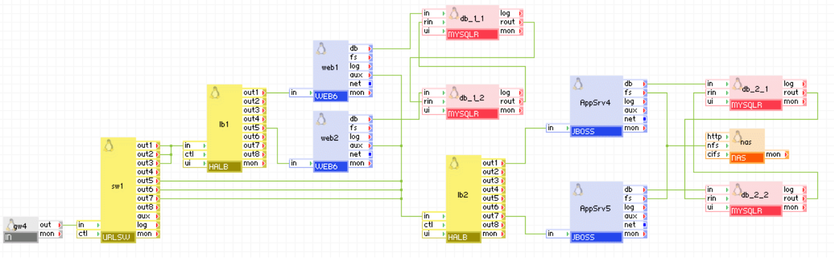 gw4 输入网关接收传入请求,并将其转发到 URL 交换机 sw1,sw1 将对静态内容的请求(通过输出终端 1-3 发送,经由负载均衡器 lb1,然后到达 Web 前端服务器 web1 和 web2)与应用调用(通过输出终端 5-7 发送,经由后端负载均衡器 lb2,然后到达 JBoss 应用服务器 AppSrv4 和 AppSrv5)分离。 前端 Web 服务器场(web1 和 web2)处理传入请求,并且使用静态内容回复,或通过第二个负载均衡器 lb2 将请求转发到后端服务器。 前端服务器使用群集的 MySQL 数据库组件 db_1_1 和 db_1_2。 第二个负载均衡器 lb2 在群集的 JBoss 组件 AppSrv4 和 AppSrv5 之间平衡流量。 它们又使用群集的数据库组件 db_2_1 和 db_2_2。 数据存储通过 NFS 由 NAS 组件 nas 提供。