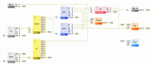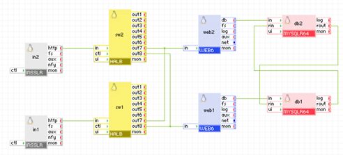 Client request arrive on the in1 gateway. The gateway forwards the requests to the web_lb load balancer, which directs the request to one of the web servers web1 and web2. The web servers access the db database. The db appliance connects to the remote application (which is an identical copy, the only difference being the server_id of db and the network setup) to replicate the database. The remote application connects to the db appliance via the repl_in gateway which is configured to allow connection only from the repl_out gateway of the remote application. The db appliances in the two applications are running in master-master setup so they always have identical data.