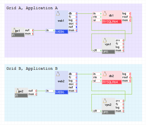 db1 from Grid A sends traffic to vpn1 for replication purposes, where it is encrypted and transmitted to vpn2 which decrypts the traffic and sends it to the rin terminal of db2 on Grid B. Likewise, replication from db2 on Grid B to db1 on the Grid A behaves in the same manner.