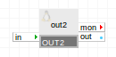 OUT2 is an output gateway that provides access to a network host located outside of an application. OUT2 accepts traffic from the application on its in terminal and forwards it through its out terminal to the remote host.