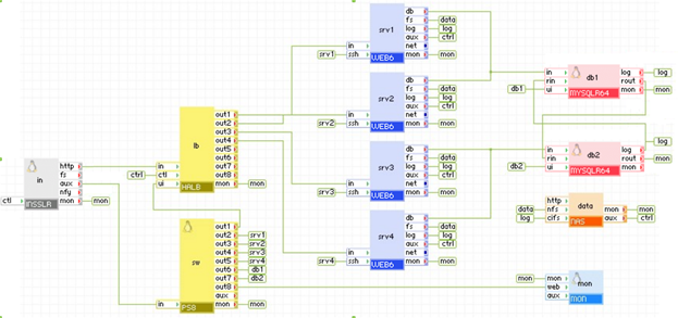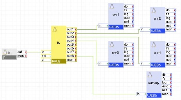 The diagram below shows a clustered environment with multiple web and database servers. Every web and database server has a feedback connection to the ctl terminal of HALB. If a web server detects a problem with database/connectivity/performance, it can disable the corresponding output terminal, thus ordering HALB to stop directing traffic to the web server. Similarly, any database server can disable the output terminals of HALB, thus disabling all incoming traffic. After the resolution of the problem, output terminals may be re-enabled.