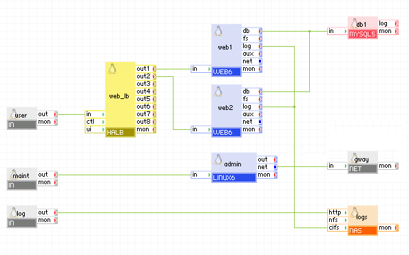 El diagrama siguiente muestra un uso típico del dispositivo mysql en una aplicación Web de dos niveles en la cual la base de datos se utiliza para compartir los estados y los datos entre varios servidores Web con equilibrio de carga. Además, este ejemplo tiene una entrada independiente para mantenimiento a través de la cual un administrador puede iniciar sesión y acceder a la base de datos para mantenimiento, así como una entrada a través de la cual un administrador puede iniciar sesión y ver el registro de errores de mysql.