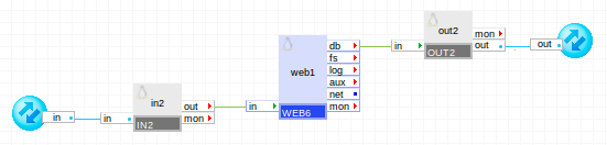 Se utiliza OUT2 para acceder a servicios de fuera de la aplicación, como una base de datos, un servicio Web o un repositorio de documentos externo. OUT2 es el único dispositivo de una aplicación que debe configurarse con el nombre o dirección IP del host remoto. Los demás componentes de la aplicación pueden acceder a este host simplemente si se conectan a la entrada del dispositivo OUT2.