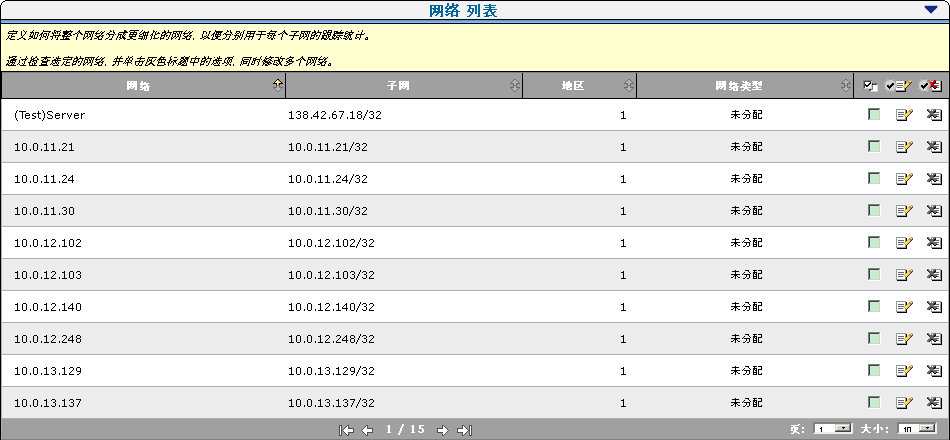 使用“网络列表”可以管理管理控制台监视的客户端网络的列表。 每个监视设备会计算应用程序服务器与“网络列表”中指定的客户端网络之间的响应时间度量标准。