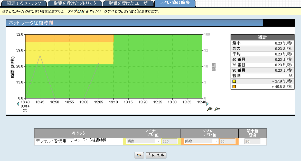 [操作]ページの[エクスプローラ]ボタンから、管理コンソール 管理者またはネットワーク オペレータは、特定のメトリックのしきい値を変更できます。 [操作]ページからしきい値を変更するには、クライアント ネットワーク、サーバ、アプリケーションおよびメトリックを選択することで、その問題を分離します。 次に、[エクスプローラ]をクリックし選択されたメトリックのしきい値を編集します。