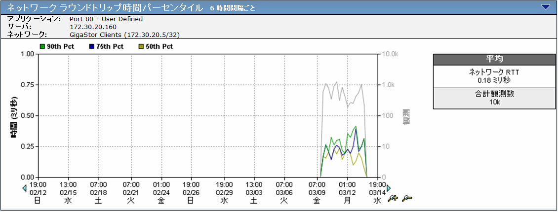 - これらの手順を繰り返し、ネットワーク ラウンドトリップ時間およびサーバ レスポンス時間を含む、運用レベル メトリックの各々に対する 90 および最大のパーセンタイルを収集します。 トランザクション時間の場合、ネットワーク ラウンドトリップ時間、サーバ レスポンス時間、再送信遅延、データ転送時間の 90 および最大のパーセンタイルを合計および平均します。