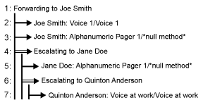 Joe Smith is a contact who can be contacted by the Voice 1 and the Alphanumeric Pager 1 methods. Joe escalates to Jane Doe. Jane can be contacted by the Alphanumeric Pager 1 method. Jane escalates to Quinton Anderson. Quinton can be contacted by the Voice at Work method. Quinton does not escalate to anyone. The call tree for this example would look as follows: