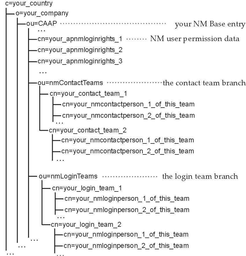 Also under the base directory, you can optionally establish two subdirectories, and use them to assign permissions to many logins, and/or for many contacts. For example, you can create an organizational unit entry named nmContactTeams and put all apnmContactPerson entries together into teams of contacts under this entry. You can also create an organizational unit entry named nmLoginTeams and put all apnmLoginPerson entries together into teams of logins under this entry.