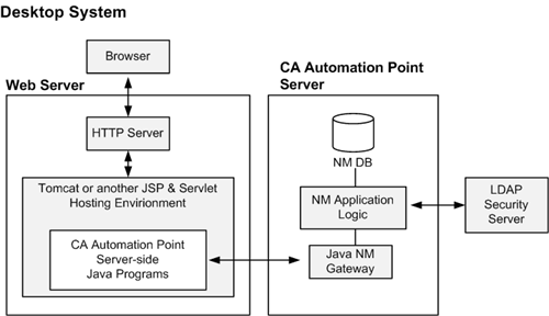 Note that your web server environment must provide a servlet hosting facility. CA Automation Point redistributes the free Apache Tomcat servlet hosting application for those sites that do not have their own servlet hosting software. For details, see the Administrator Guide.