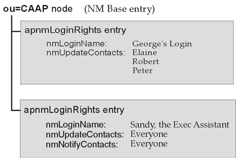 A site can easily assign permissions for individual contacts to individual logins by creating new entries of apnmLoginRights objectClass in the LDAP tree. In the following scenario, George, the marketing director can read and update contact information for all the marketing staff, including Elaine, Robert and Peter. Sandy, Brian's assistant, can notify and help maintain contact information for every NM contact, even though she may not have a corresponding contact in the NM database.