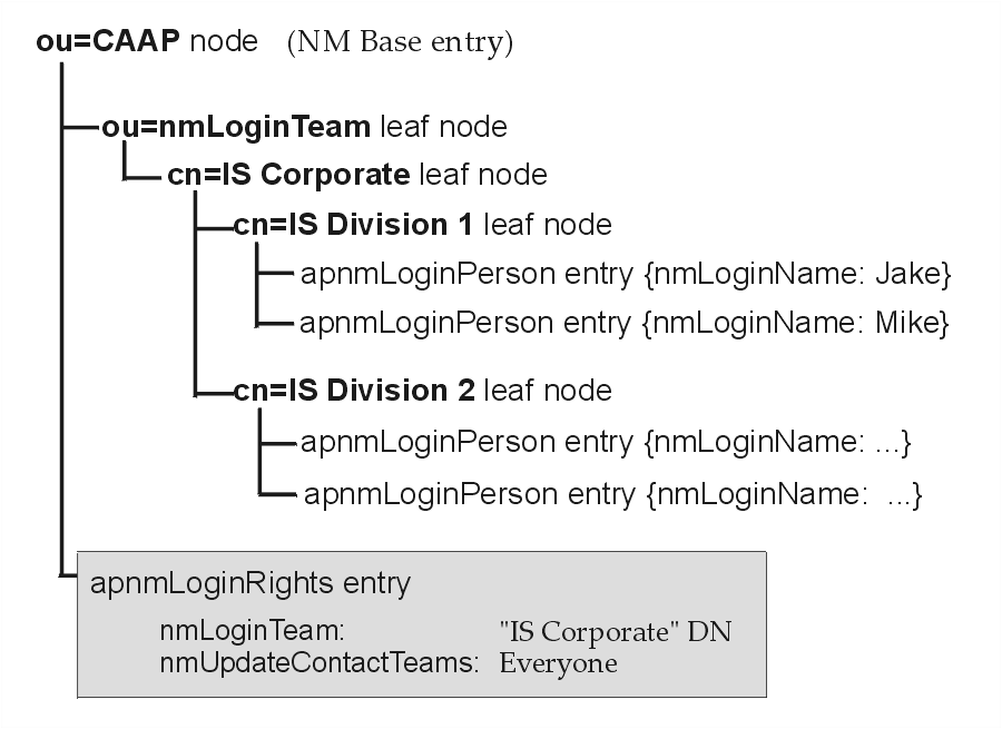 In the following scenario, all IS people, including Jake, Mike, and the technicians in "Division 2," can maintain contact information for every NM contact. If Jake hires Fred tomorrow and adds Fred to the IS Division 1 branch in the LDAP tree, Fred automatically gets all the permissions his group has.