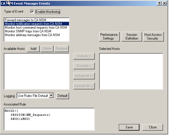 To configure the Event Traffic Controller, select Expert Interface, Automation, Events Interface, CA NSM Event Manager Events from the Configuration Manager main window. The CA NSM Event Manager Events dialog displays: