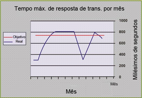 Observe que medir o tempo de resposta como um valor máximo é uma obrigação muito restrita e muito difícil de se atingir na prática. Medir um nível máximo significa que uma única transação de 751ms dentre um milhão de transações realizadas durante um mês é o suficiente para violar o contrato. Todas as barras em relatórios serão vermelhas e não refletirão a qualidade real do serviço prestado.