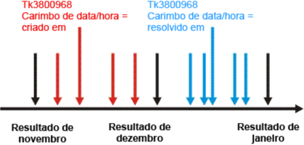 Se o valor Criado em for usado como o carimbo de data e hora, o ticket será incluído nos resultados de dezembro. Se o valor Resolvido em for usado como o carimbo de data e hora, o ticket será incluído nos resultados de janeiro. As duas opções são viáveis. A seleção precisa apenas atender às expectativas com relação ao local em que os tickets devem ser exibidos nos relatórios.