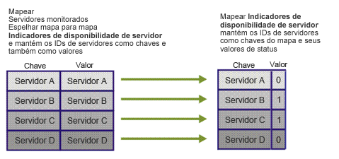 Para fazer isso, a fórmula é necessária para manter um mapa (mapa ServerAvailabilityIndicators no código de exemplo a seguir) que tem uma entrada para cada um dos recursos monitorados. Como todos os objetos do mapa requerem um campo chave para fazer referência ao valor associado, este mapa terá o indicador de recursos como a chave (que é a ID do recurso) e o valor será o componente de status. Sempre que o status de um componente é alterado, a entrada relevante do mapa deve ser alterada. De acordo com o evento de disponibilidade, a fórmula atualizará o status do recurso relevante no mapa e irá reavaliar o status do sistema adequadamente.