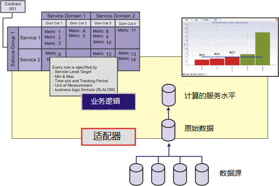 下图描绘了在 CA Business Service Insight 中的业务逻辑位置。 它在合同中的每个度量标准之下。