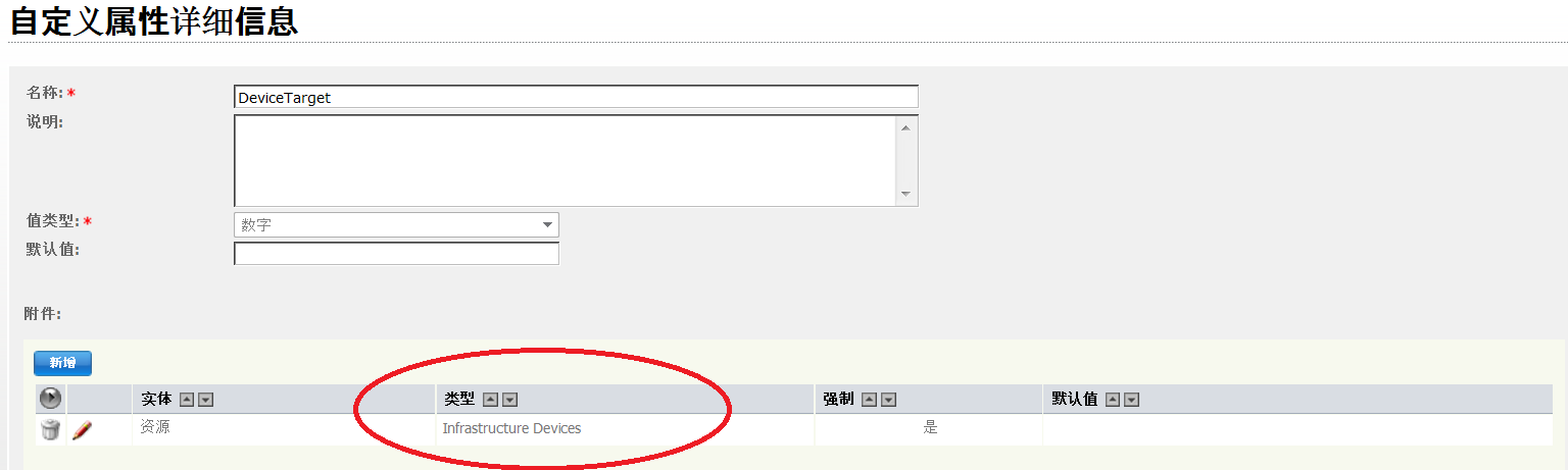 因此,需要先通过将自定义属性添加到这些设备(其中所有设备都是“基础架构设备”类型的资源)的资源类型中的方式来创建自定义属性。 创建的自定义属性被称为“DeviceTarget”,并且可以从位于服务目录 > 自定义属性的菜单中添加。 注意,在创建自定义属性时,您必须将它链接到需要它的资源类型。