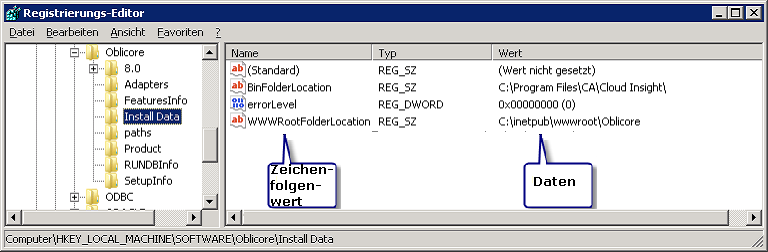 - Öffnen Sie in der Registrierung auf dem Webserver oder Webservices-Server den Eintrag: HKEY_LOCAL_MACHINE\SOFTWARE\Oblicore\Install Data.