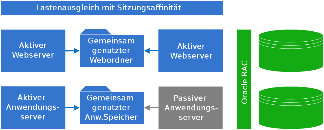 Sowohl Web- als auch Anwendungsserver benötigen ein gemeinsam genutztes Hochverfügbarkeits-Dateisystem, um Dateien über Knoten hinweg gemeinsam zu nutzen. Dieses System wird vom Kunden über eine beliebige Speicherumgebung zur Verfügung gestellt, die mit Hochverfügbarkeitsanforderungen konform ist.