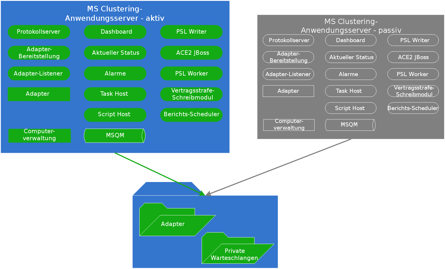Die zugrunde liegende Hochverfügbarkeitsinfrastruktur ist so konfiguriert, dass ein Failover der Dienste vom aktiven Server zum passiven Server durchgeführt wird.