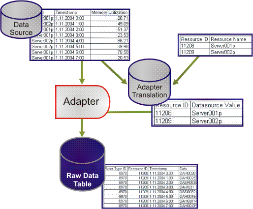 The process of attaching the Resource ID and Event Type ID to the relevant data source value is called Adapter translation. During this process, the translation table is created with the matching values. This table is used by the Adapter in order to populate the relevant Event Type ID and Resource IDs in the Event record that it is creating. Independent tables are created for translating Resources and Event types.