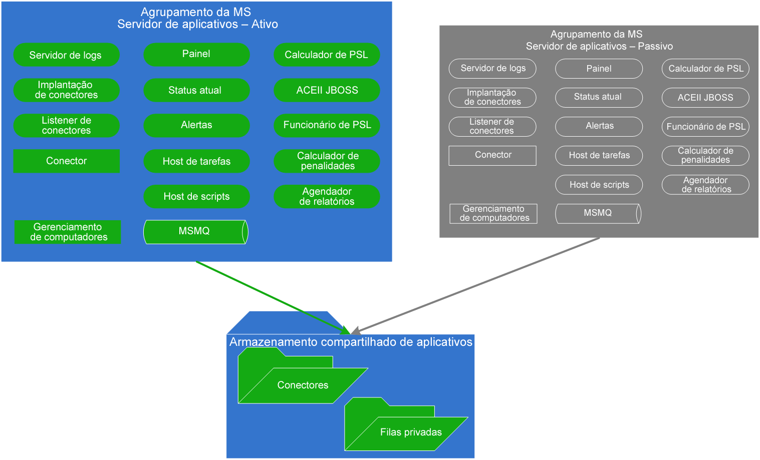 O servidor de aplicativos é implantado em um modo ativo/passivo. Isso significa que os serviços em execução no servidor de aplicativos são executados somente em um dos servidores em qualquer momento determinado.