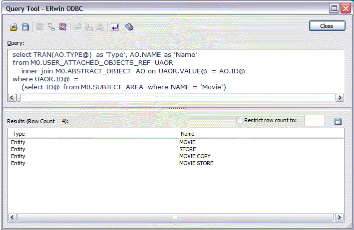 For example, a Subject_Area object holds a vector property that contains the IDs of all Entity objects that are members. This property has a class name of Referenced_Entities_Ref, which becomes the REFERENCED_ENTITIES_REF table. You can use the following query if you wanted to see the names and types of all members of the Movie subject area in the eMovies.ERWIN model.