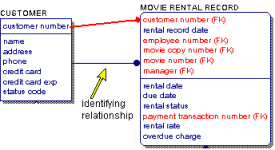 The following diagram shows the relationship between the CUSTOMER entity and the MOVIE RENTAL RECORD entity using Integration DEFinition (IDEF1X) notation: